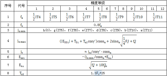 A5各精度等級的極限偏差和公差與蝸杆、蝸輪幾何參數的關系式見表A3、表A4。