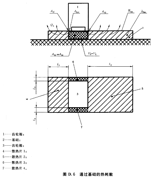 基礎傳導的熱計算是建立在将齒輪箱基礎分割成幾個部分,每一部分被看作爲一個單獨的散熱片 ,使用從熱力學得出的已知散熱片計算公式。沿各部分表面的熱流Aqi相加得到整個基礎的熱傳導量(見圖D.6)。