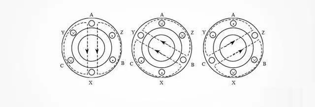 當(dāng)交流電相位θ=2400時,IC=0,IA爲負,IB爲正,此時,線端C、Z沒有電流,繞組AX電流從(cóng)X流進A流出 ,繞組BY電流從(cóng)B流進Y流出,由安培右手螺旋定則得到圖(c)中磁感線方向(如虛線箭頭所示)。