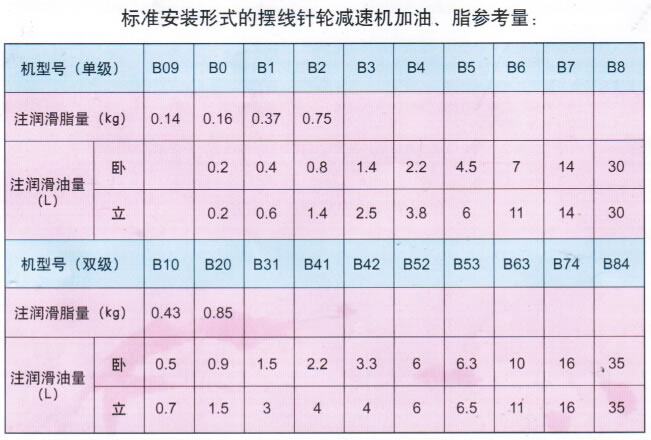 擺線針輪減速機潤滑油、脂參考量表及潤滑方式