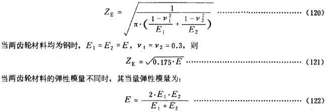 彈性系數ZE是用以考慮材料彈性模量E泊桑比v對赫茲應力的影響。其數值可按實際的材料彈性模量E和泊桑比v由式(120)計算得出。對於某些常用材料組合的ZE可參考表14查取。