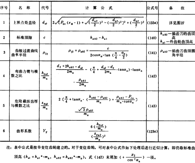 ρf——30°切線切點處曲率半徑 。外齒輪由式(132)計算,内齒輪由式(141)計算。