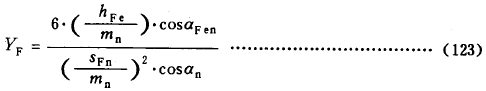 式(123)适用於标準或變位的直齒輪和斜齒輪。對於斜齒輪,齒形系數按法截面確定,即按當量齒數ZV進行計算。大 、小輪的齒形系數應分别確定。ZV應按式(128)計算,或由圖30至圖32查取。