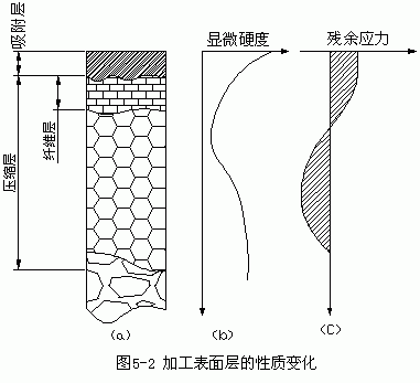 表面層的物理力學性能包括表面層的加工硬化、殘餘應力和表面層的金相組織變化。機械零件在加工中由於受切削力和熱的綜合作用,表面層金屬的物理力學性能相對於基本金屬的物理力學性能發生瞭(le)變化。圖 5— 2a所示爲零件表面層沿深度方向的變化。最外層生成有氧化膜或其他化合物,並(bìng)吸收、滲進氣體粒子,稱爲吸附層。吸附層下是壓縮層 ,它是由於切削力的作用造成的塑性變形區,其上部是由於刀具的擠壓摩擦而産生的纖維層。切削熱的作用也會使工件表面層材料産生相變及晶粒大小變化。