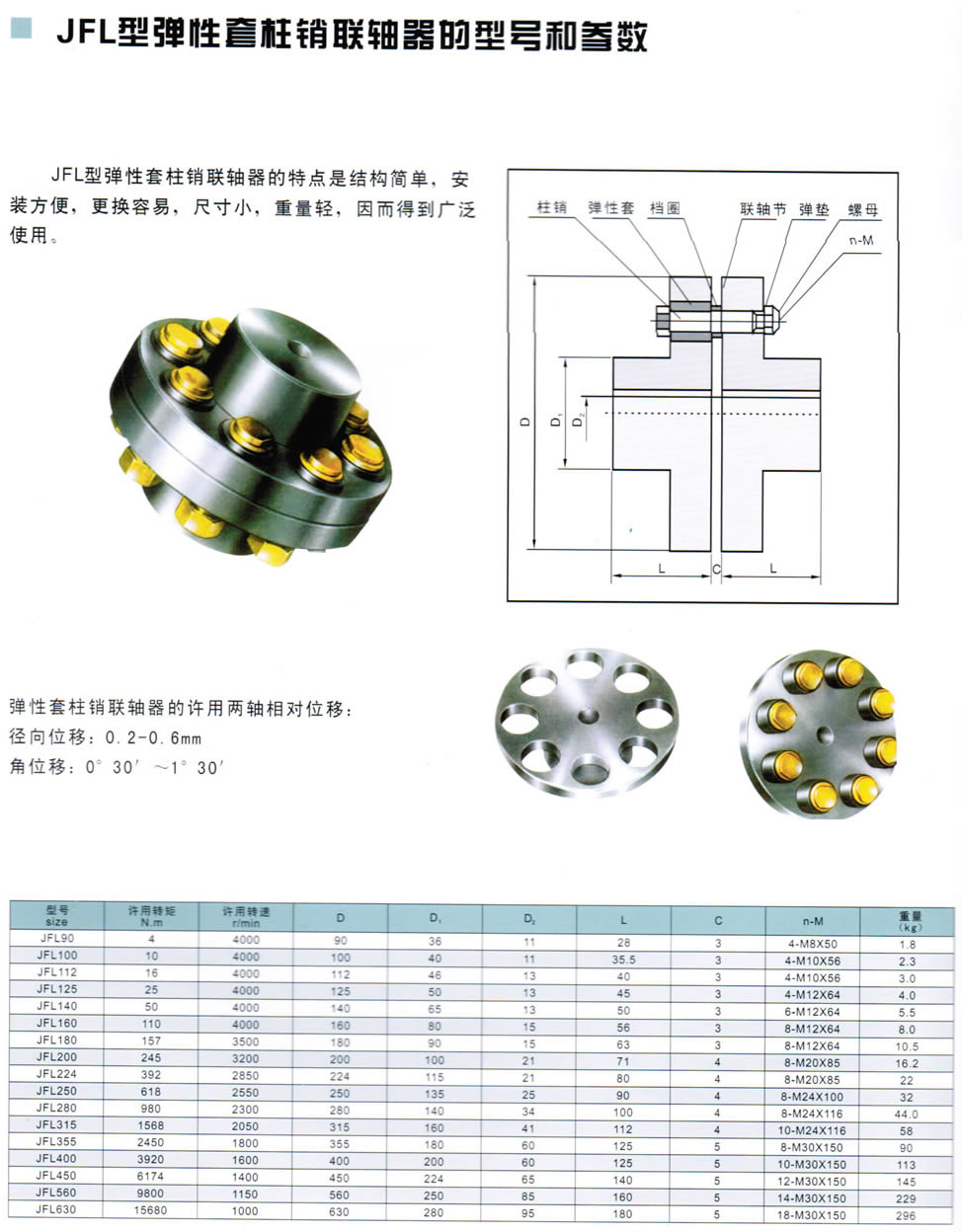 彈性套柱銷聯軸器的許用兩軸相對位移: 徑向位移:0.2-0.6mm 角位移: 0 30' - 1 30