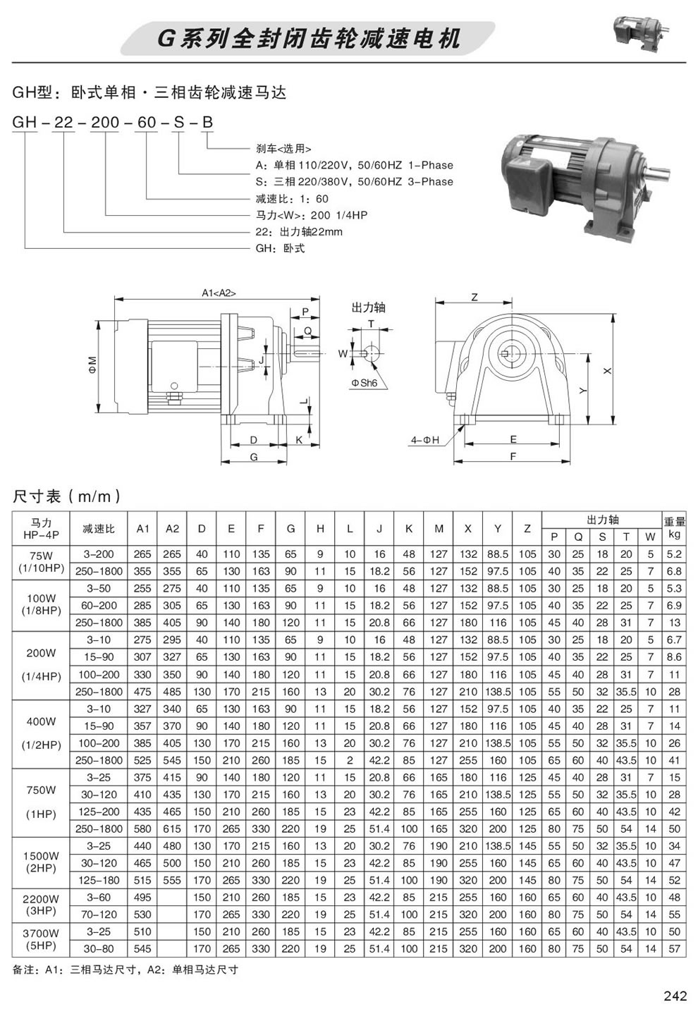 GH卧式型号表示及尺寸表 - G全封閉齒輪減速電機