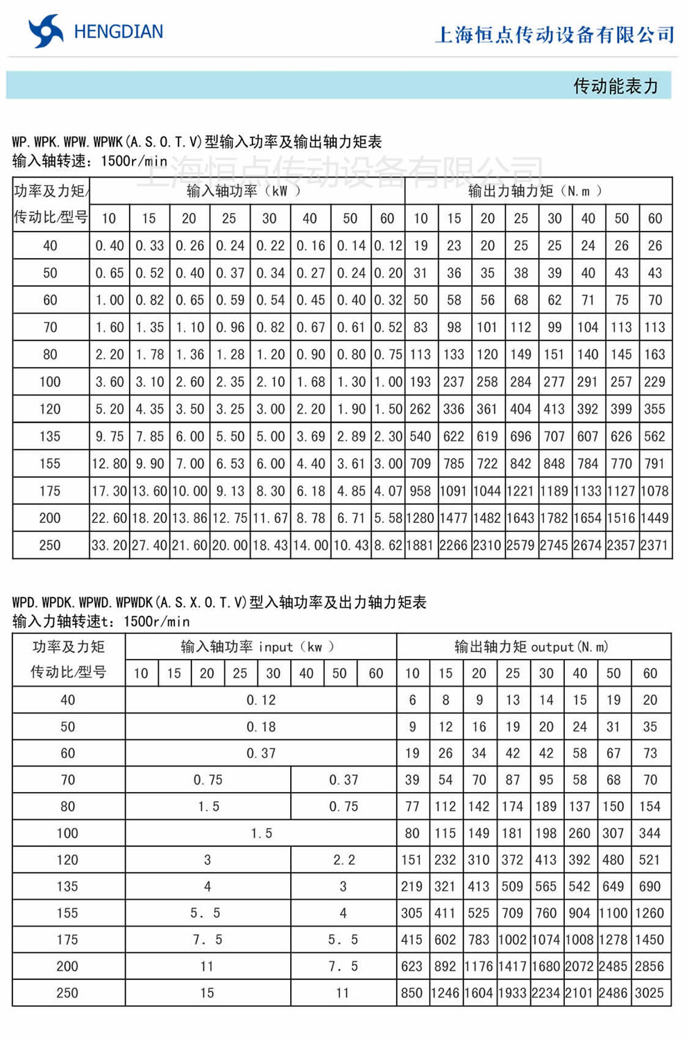 WP.WPK.WPW.WPWK(A.S.O.T.V)型蝸輪蝸杆減速機輸入功率及輸出軸力矩表,WPD.WPDK.WPWD.WPWDK(A.S.X.O.T.V)型減速機入軸功率及出力軸力矩表