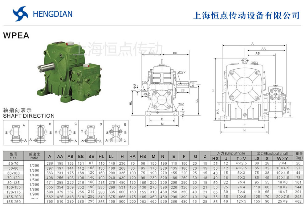 WPEA雙級減速機的外形安裝尺寸.WPEA雙級蝸輪蝸杆減速機選型指南,WPEA雙級減速機軸輸入,軸輸出.WPEA雙級減速機軸指向表示方法.機座号40-70到155-250,速比200到900.